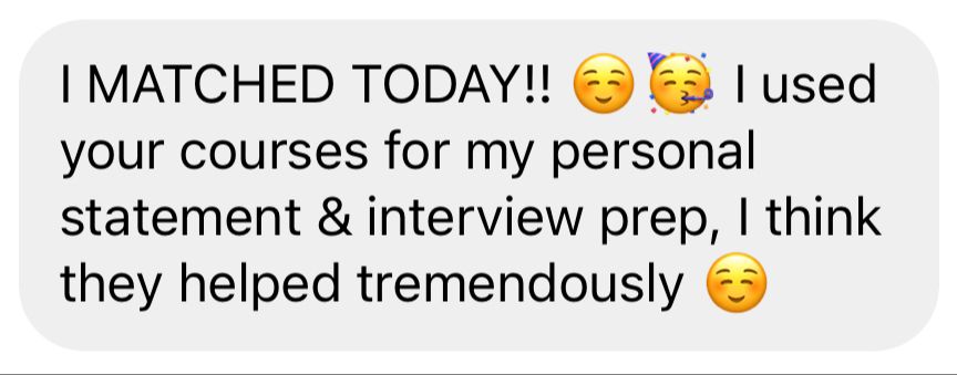 "I used both the personal statement course and the ERAS guide. Both were extremely helpful in alleviating the stress and anxiety of the match process. They gave me an systematic approach to make both my personal statement and application stand out. I was able to match into OB/Gyn. Thank you!"
